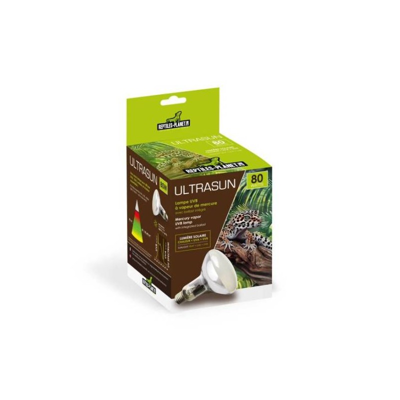LAMPE A VAPEUR DE MERCURE A SPECTRE COMPLET POUR LEZARDS ET TORTUES Les lampes Ultra Sun Reptiles Planet offrent aux reptiles des UVA et UVB proches de la lumière du soleil. Les UVB émis sont actuellement les plus puissant du marché avec 3 modèles : 80W (µW/cm² : 40 à 80) , 100W (µW/cm² : 80 à 200) et 160W (µW/cm² : 200 à 500). Pour chauffer et éclairer : la lampe va permettre aux animaux de recevoir des UVB nécessaires, mais aussi de se chauffer (point chaud) durant la journée. Ces lampes ont initialement été conçues pour les iguanes, car la plupart des tubes fluorescents ne portaient pas assez loin dans les grands vivariums arboricoles. Elles sont idéales pour les : agames barbus, les dragons d’eau, les caméléons, les anolis chevaliers, les tortues sillonnées ou léopards etc … - Une puissance équilibrée des UVB quelque soit la diistance - Deux modèles pour s’adapter à la hauteur des grands vivariums grillagés - Ratio 10% UVB, 30% d’UVA - Installation simplifiées car les lampes sont auto ballastées. Elle se visse dans une douille en céramique standard (E27). - Nouveau modèle à usage intensif NB : Vous devez permettre à votre animal de grimper à différentes hauteurs (même les tortues) en réalisant des promontoires. Cela lui permettra de choisir les UV et la chaleur dont il a besoin. Diamètre lampe: environ 10cm