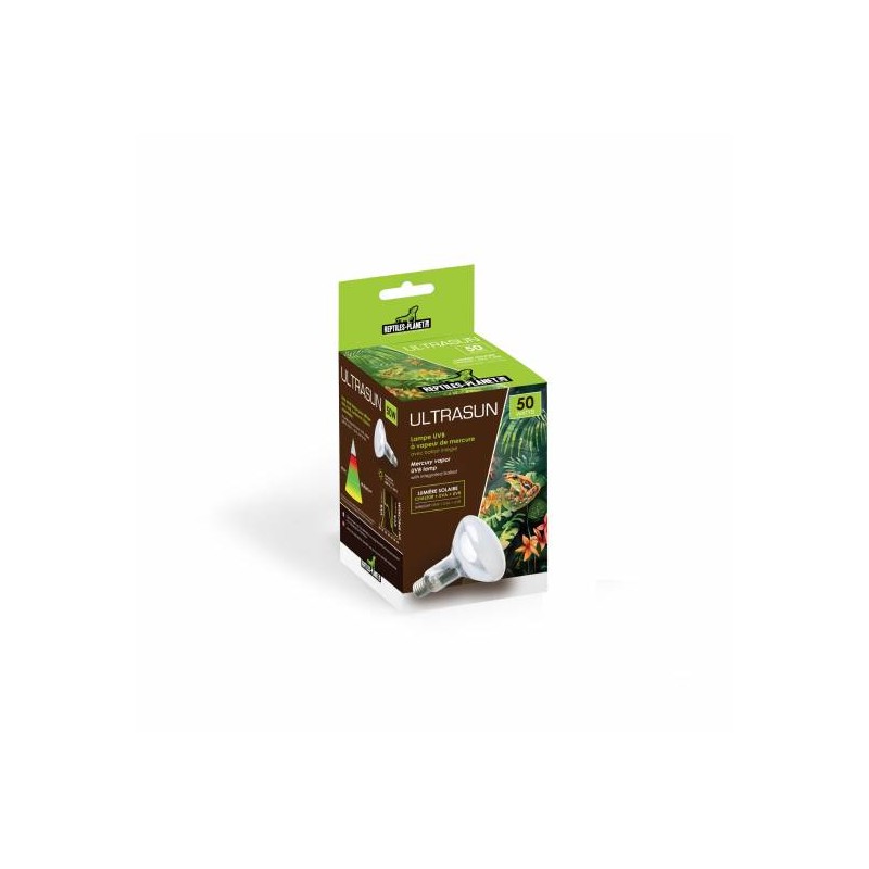 Lampe à vapeur de mercure à spectre complet pour lézards et tortuesLes lampes Ultra Sun Reptiles Planet offrent aux reptiles des UVA et UVB proches de la lumière du soleil. Les UVB émis sont actuellement les plus puissant du marché avec 2 modèles : 100W (µW/cm² : 80 à 200) et 160W (µW/cm² : 200 à 500).