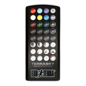 Avec ses 24 ampoules à DEL blanches très brillantes de 6 500 K et ses 12 ampoules tricolores RVB, la rampe d’éclairage TerraSky comprend un spectre de lumière entièrement personnalisable capable de reproduire plusieurs habitats naturels. La rampe d’éclairage TerraSky pour terrariums avec plantes inclut aussi 11 préréglages (couverture nuageuse, lever du soleil, coucher de soleil, Lune, orage, éclairs) et 6 différents réglages de couleurs préprogrammés. La télécommande comprend 4 touches mémoires pour sauvegarder des réglages personnalisés.