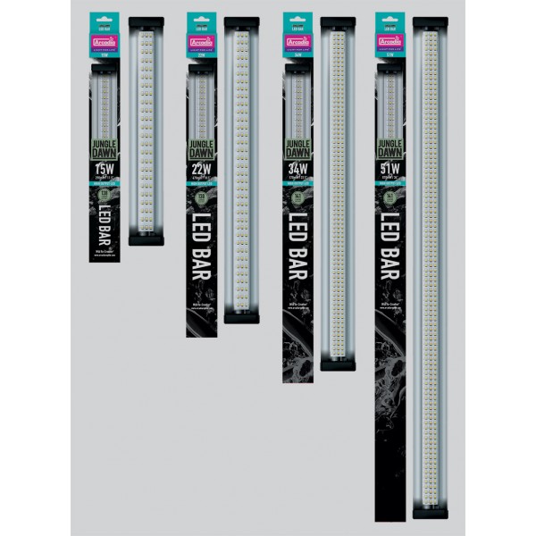 Les Arcadia Reptile JungleDawn LED Bar utilise une configuration “Triple Track” avec un niveau élevé de projection interne intégrée. Ce système perfectionné projettera un flux d’éclairage très large, uniforme et utilisable, éliminant les risques associés aux lampes à LED « à source concentré ».