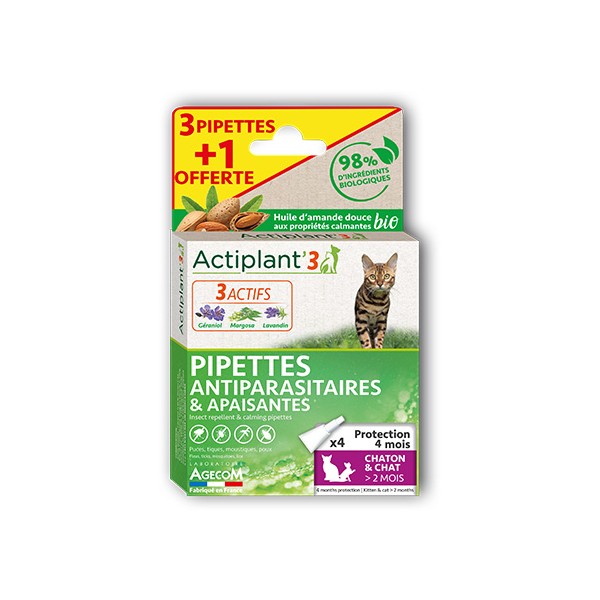 Propriétés La pipette insectifuge et calmante Actiplant’3 a été spécialement formulée à partir de substances actives inspirées du monde végétal et reconnues pour leurs propriétés répulsives : Géraniol, Margosa, Lavandin. Chaque substance a une action spécifique sur les parasites externes (puces, tiques, moustiques et poux). La combinaison de ces principes actifs associés dans une même formule crée un véritable booster et permet une action renforcée sur les parasites. Riche en vitamines, en oligo-éléments, en agents antioxydants et grâce à ses propriétés apaisantes, l’huile d’amande douce nourrit et hydrate la peau et le poil de votre animal tout en calmant d’éventuelles démangeaisons. Mode d’emploi • Tenir la pipette à la verticale. Enlever le bouchon, la retourner et percer l’opercule de la pipette. • Appliquer son contenu sur 3 points minimum (entre le bas du crâne et le creux des épaules en écartant le pelage). La protection est effective après 2 à 3 jours. Ne pas appliquer sur un animal en partie mouillé car la protection pourrait être réduite. • Éliminer l’emballage • Se laver les mains. Ne pas laver l’animal dans les 72h suivant l’application. A renouveler toutesles 4 semaines. Précautions d’utilisation Le mélange est un produit à usage biocide. Produit à usage externe destiné au chat. Ne pas utiliser chez un animal malade ou convalescent. Ne pas masser l’animal à l’endroit où les gouttes ont été appliquées. Ne pas hésiter à retraiter l’animal si des signes d’infestation se manifestent. Ne pas avaler. Ne pas utiliser pour un autre usage que celui pour lequel le produit est destiné. Contient du géraniol : peut provoquer une réaction allergique. Peut provoquer une allergie cutanée. En cas d’irritation ou d’éruption cutanée : consulter un médecin. En cas de consultation d’un médecin, garder à disposition l’étui. Éliminer le contenu/le récipient conformément à la réglementation locale. Conserver au sec et au frais.