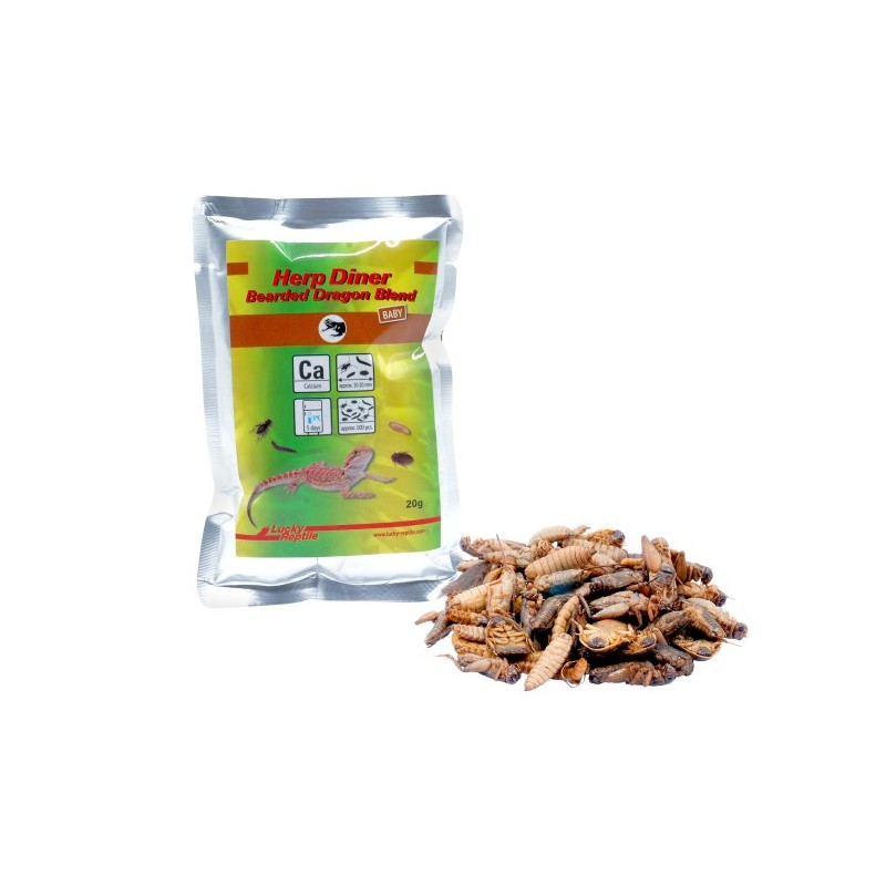 L'aliment Herp Diner Bearded Dragon Blend Baby est un mélange spécialement formulé pour les jeunes dragons barbus et autres reptiles insectivores. Sa composition équilibrée, composée de petits grillons, de larves de mouches soldats, de blattes et de vers de farine cuits délicatement, constitue une base optimale pour une alimentation adaptée à l'espèce durant sa phase de croissance initiale.