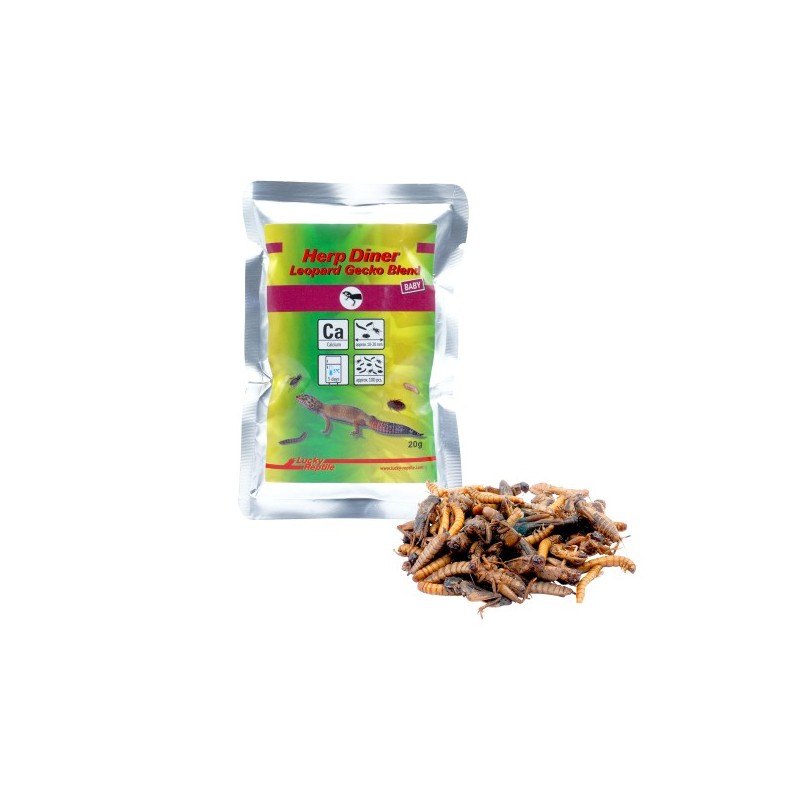 L'aliment Herp Diner Leopard Gecko Blend Baby est un mélange spécialement formulé pour les jeunes geckos léopards et autres petits reptiles insectivores. Sa composition soigneusement équilibrée, composée de petits grillons, de vers de farine, de larves de mouches soldats et de blattes cuits délicatement, constitue une base alimentaire complète et adaptée à l'espèce pendant sa croissance.