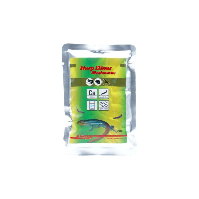 Les vers de farine sont les larves du tribolium et constituent un mets de choix pour les reptiles et oiseaux insectivores, ainsi que pour les poissons. Les tortues en raffolent également. Pour améliorer leur valeur nutritionnelle, les vers de farine Lucky Reptile Herp Diner sont cuits avec de la poudre d'os de seiche. Ceci garantit un apport élevé en calcium, un élément essentiel à l'alimentation des reptiles, oiseaux et poissons.