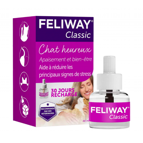 ELIWAY Classic est une solution idéale pour aider votre chat à se sentir bien à la maison et pour réduire les signes de stress tels que : Griffades, Marquage urinaire, Peurs, Réactions aux changements Jusqu'à 30 jours de sérénité 3 x Flacon FELIWAY Classic 48 ml