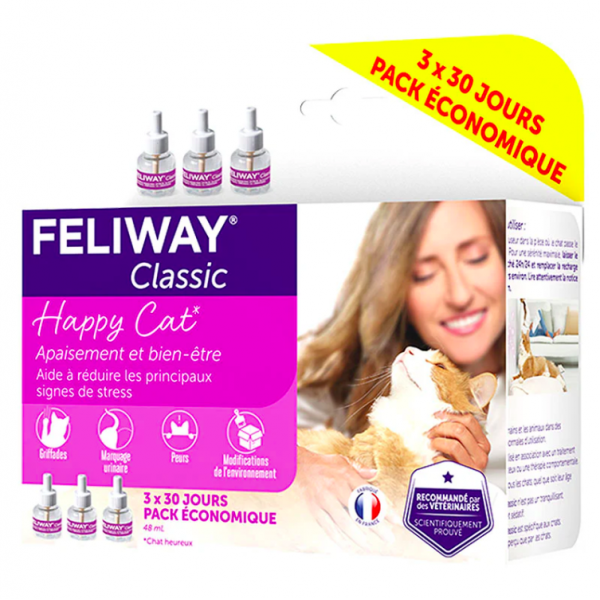 La solution FELIWAY la plus avancée pour aider à résoudre les principaux signes de stress chez le chat : Griffades, Marquage urinaire, Peurs, Réactions aux changements Jusqu'à 90 jours de sérénité 3 x Flacon FELIWAY Optimum 48 ml