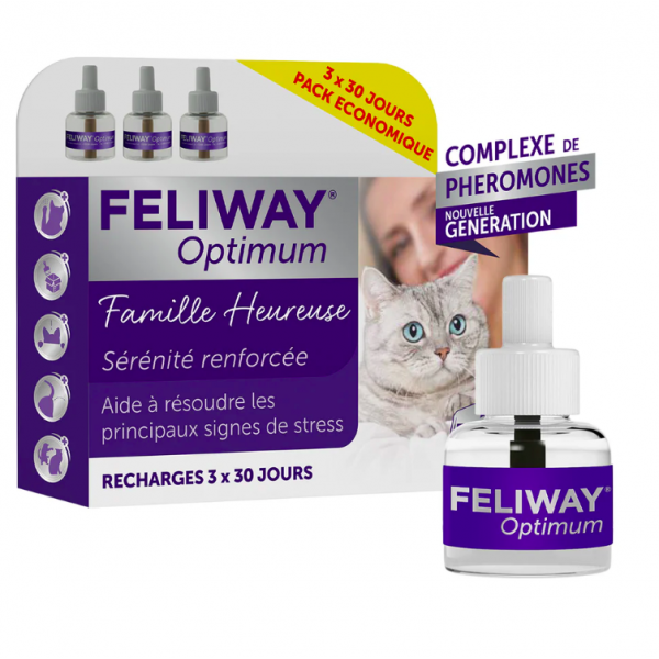 La solution FELIWAY la plus avancée pour aider à résoudre les principaux signes de stress chez le chat : Griffades, Marquage urinaire, Peurs, Réactions aux changements Jusqu'à 30 jours de sérénité 1 x Diffuseur 1 x Flacon FELIWAY Optimum 48 ml