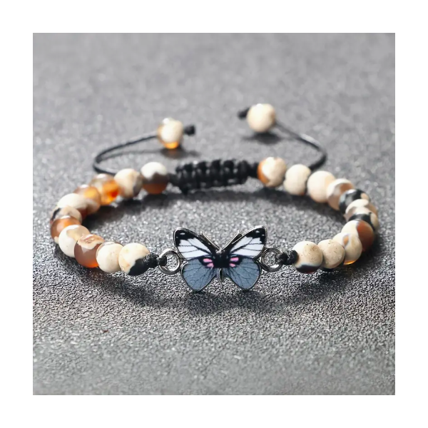 Bracelet Papillon Gris Artisanal avec Perles d'Agate Naturelles