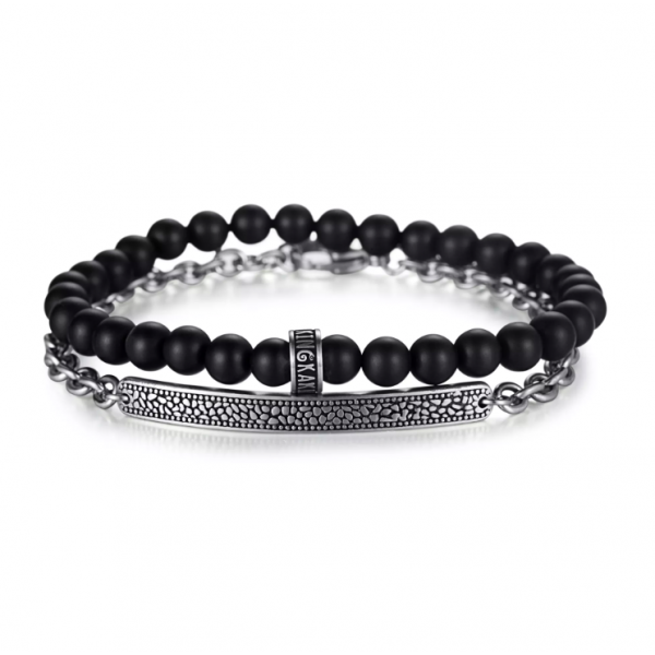 ENSEMBLE DE BRACELET HOMME Onyx noir mat en pierres de 8 mm avec chaîne en acier inoxydable combinée à un fermoir de homard reptile comme un ensemble