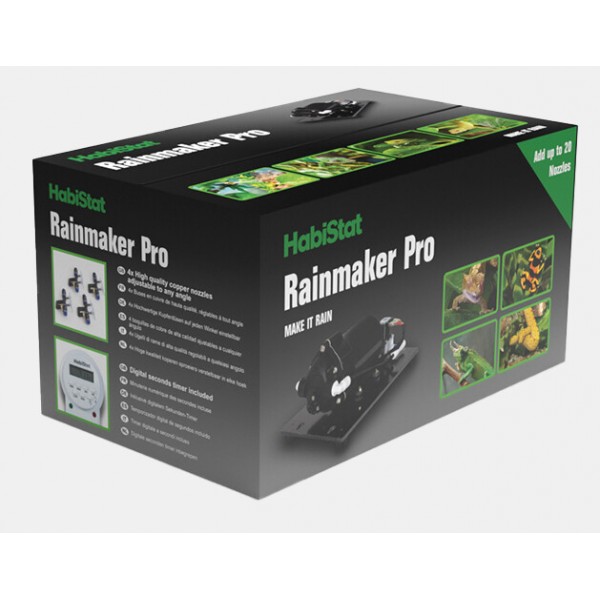Le Rainmaker Pro comprend une pompe puissante qui permet d'alimenter en "pluie" des systèmes ou des racks de plus grande taille. Le programmateur inclus vous permet de programmer vos propres jours et heures de pluie.