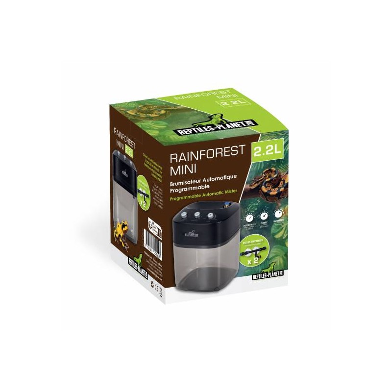 Le Rainforest Mini est conçu pour les installations plus compactes. Son réservoir de 2,2 litres convient à un terrarium de petite à moyenne taille. Il est livré avec deux buses permettant une diffusion régulière de la brume et un maintien efficace de l’humidité.