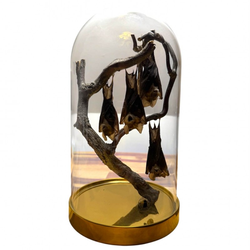 Véritable chauve-souris sécher (Hipposideros bicolor) présenter sous une cloche en verre avec un socle en métal cuivré et un perchoir en bois. Longueur: 20 cm Diamètre: 11 cm