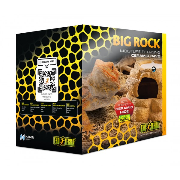 Les reptiles ne disposant pas d’un endroit sûr pour se cacher et dormir subiront facilement un stress qui perturbera leur mode de vie et leur appétit. La grotte hygroscopique Big Rock d’Exo Terra® vient ainsi offrir à vos reptiles, amphibiens ou invertébrés une cachette sûre où se reposer en plus de créer un microclimat humide qui favorise la thermorégulation, assure une bonne hydratation et facilite la mue des reptiles. Grâce à ses propriétés hygroscopiques exceptionnelles, la céramique dont est composée la grotte permet une régulation naturelle de la température et du taux d’humidité dans la cachette en absorbant l’eau du réservoir puis en la libérant lentement sous forme d’humidité. Un contrôle adéquat des conditions hygrométriques du terrarium est alors assuré, ce qui permet de prévenir les infections respiratoires chez vos animaux en créant un environnement sain. De plus, cette cachette en céramique écologique s’intègre facilement à n’importe quel type de terrarium. En y ajoutant de la mousse de forêt ou de sphaigne Exo Terra® humide, vous créez du même coup un abri parfait pour la ponte d’œufs de différentes espèces de reptiles, d’amphibiens et d’invertébrés. Le couvercle amovible permet un accès facile aux reptiles pour en prendre soin ou pour retirer une couvée d’œufs que vous désirez mettre en incubation.