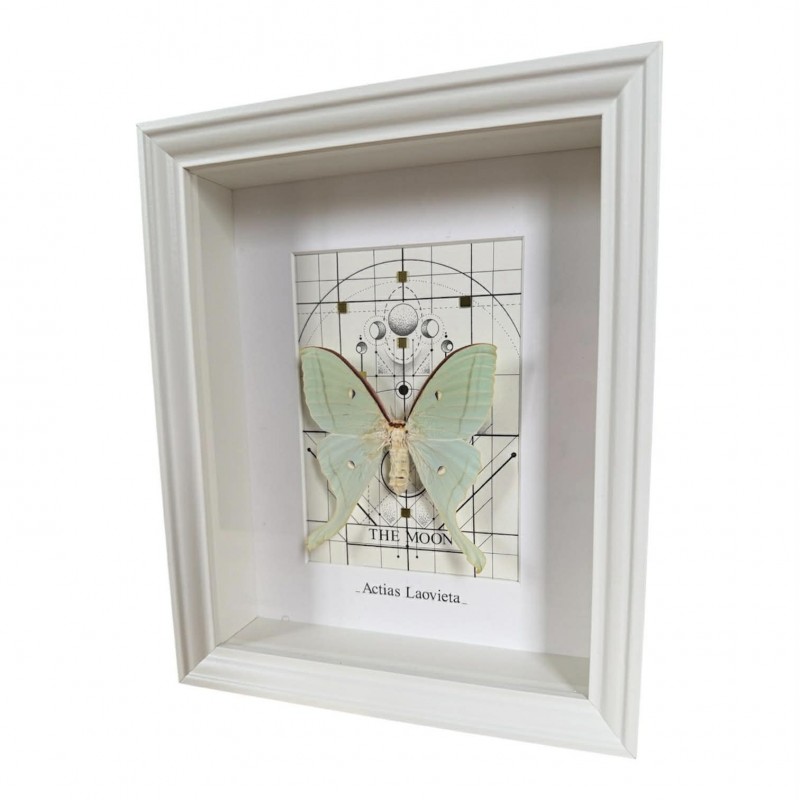 Ajoutez une touche de poésie naturelle à votre intérieur avec cette superbe Actias laovieta, délicatement présentée dans un cadre blanc 20 x 25 cm. Réputée pour ses ailes vert tendre et ses longues queues élégantes, cette espèce évoque la grâce et la légèreté des papillons lune.
