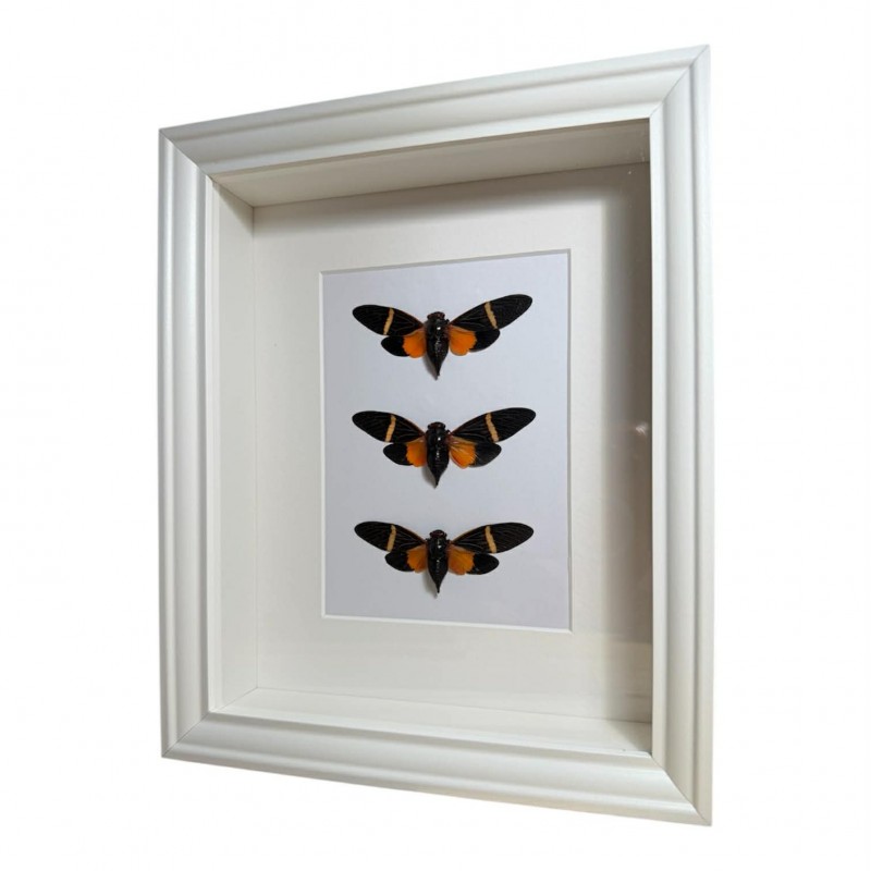 Le cadre noir met parfaitement en valeur les teintes brunes et dorées des cigales, créant un contraste raffiné qui s’intègre aussi bien dans un cabinet de curiosités que dans une décoration moderne.