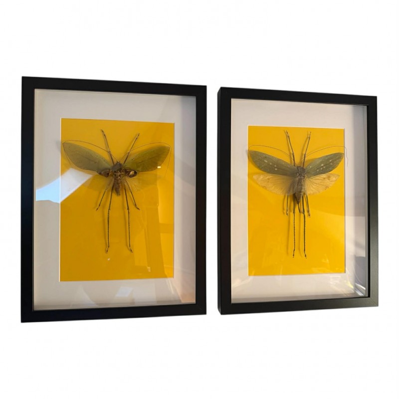 Découvrez une composition entomologique remarquable avec ce lot de deux Macrolyristes corporalis, présentés mâle et femelle dans 2 cadre noir grand format 30 x 40 cm. Ces sauterelles spectaculaires se distinguent par leur morphologie élégante et leurs ailes finement nervurées, offrant un contraste visuel saisissant entre les deux sexes.
