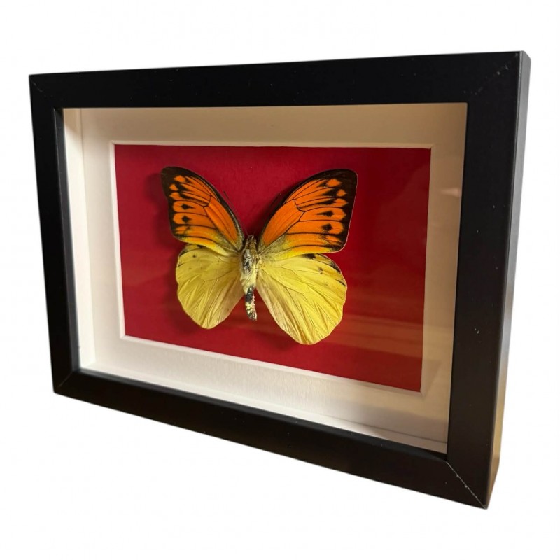 Chaque spécimen est soigneusement préparé afin de préserver la netteté de ses motifs et l’équilibre de ses couleurs. Le cadre noir souligne parfaitement le blanc lumineux des ailes et accentue l’intensité des teintes orangées, pour une présentation raffinée et contemporaine.