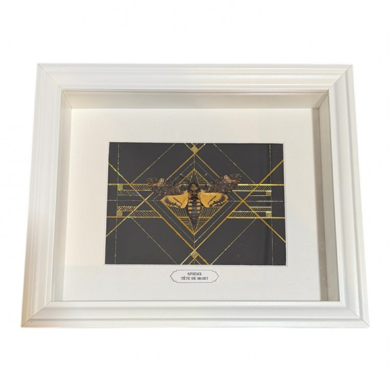 Impressionnant et iconique, le Sphinx tête de mort (Acherontia atropos) est présenté ici dans un cadre blanc épuré au format 20 × 25 cm, mettant parfaitement en valeur le célèbre motif en forme de crâne sur son thorax. Une pièce emblématique, très recherchée dans l’univers du cabinet de curiosités et de l’entomologie décorative.
