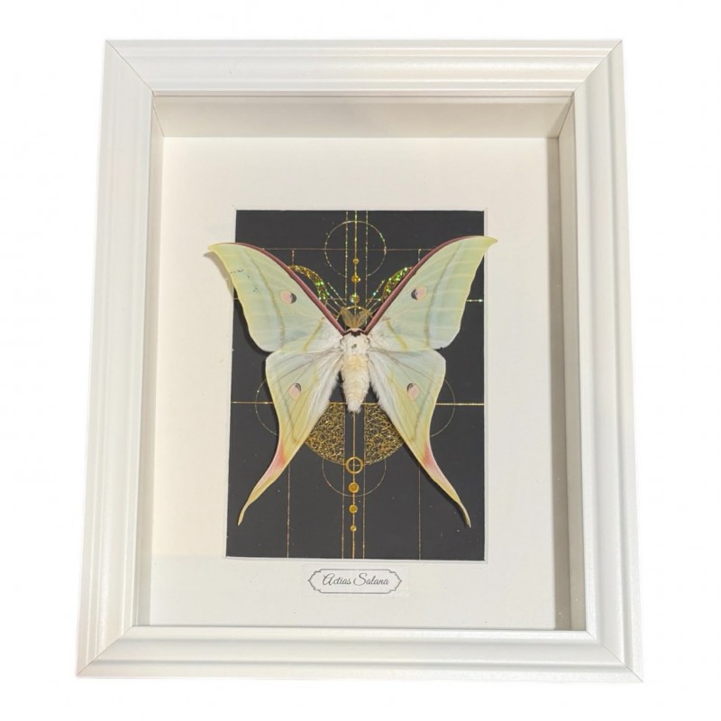 Élégant et poétique, Actias selene, aussi appelé papillon lune, est présenté dans un cadre blanc lumineux au format 20 × 25 cm. Ses longues ailes vert pâle aux reflets nacrés et ses extensions délicates en font une pièce emblématique de l’entomologie décorative et des cabinets de curiosités.