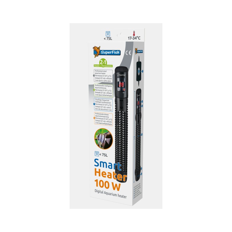 Chauffage d’aquarium intelligent professionnel 2 en 1 avec fonction thermomètre. L'élément chaufiant est très performant et compact. Affichage numérique de la température. Après avoir réglé la température désirée, l’écran affiche la température réelle jusqu’à l’atteinte de la température réglée. Thermostat fiable (17-34°C) pour un maintien uniforme de la température. La longueur du chauffage de 100, 200 et 300 W est de seulement 27 cm, le 500 W a une longueur de 30 cm. Utilisation en toute sécurité grâce au verre de sécurité de 2 mm et protecteur en plastique. Avec un câble extra long pour un montage aisé.
