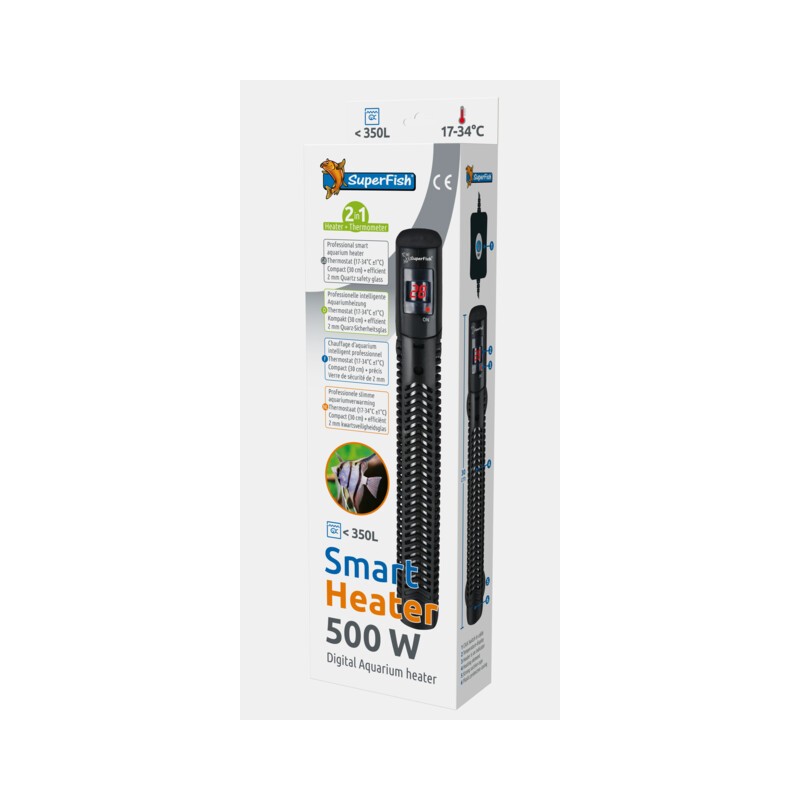 Chauffage d’aquarium intelligent professionnel 2 en 1 avec fonction thermomètre. L'élément chaufiant est très performant et compact. Affichage numérique de la température. Après avoir réglé la température désirée, l’écran affiche la température réelle jusqu’à l’atteinte de la température réglée. Thermostat fiable (17-34°C) pour un maintien uniforme de la température. La longueur du chauffage de 100, 200 et 300 W est de seulement 27 cm, le 500 W a une longueur de 30 cm. Utilisation en toute sécurité grâce au verre de sécurité de 2 mm et protecteur en plastique. Avec un câble extra long pour un montage aisé.