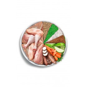 COMPOSITION : poulet frais 72%, petits pois, riz, protéines de pomme de terre, huile de poulet, foie de poulet hydrolysé, quinoa 2%, minéraux, levures, carotte 2%, pomme 1%, caroube, huile de poisson, inuline (FOS), mannane- oligosaccharides (MOS), menthe 0,05%, glucosamine, Yucca schidigera, sulfate de chondroïtine.