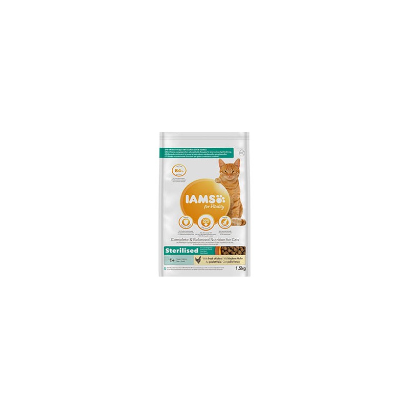 6,26€/kg Favorise les 7 signes de vitalité IAMS for Vitality au poulet frais pour chats adultes et seniors stérilisés est un aliment 100 % complet et équilibré qui entretient la santé et la vitalité de votre chat. Contient 30 % de matières grasses en moins par rapport à la recette IAMS au poulet frais pour chats adultes Système immunitaire robuste – Un...