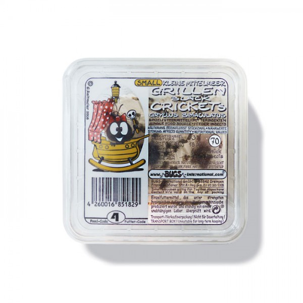 Boite de 70 Pièces en Taille 4 = 0.8-1 cm Le grillon, Achetae domestica,  Nous vous proposons 4 tailles de grillons, afin de bien respecter les proportions insecte/animal. La taille correspond au nombre de mues que le grillon a effectué depuis sa naissance :  - Taille 2 : environ 1-2 mm (2 mues) Mico - Taille 3 : environ 5-7 mm (3 mues) Petit - Taille 4...
