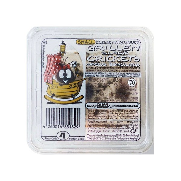 Boite de 70 Pièces en Taille 4 = 0.8-1 cm Le grillon, Achetae domestica,  Nous vous proposons 4 tailles de grillons, afin de bien respecter les proportions insecte/animal. La taille correspond au nombre de mues que le grillon a effectué depuis sa naissance :  - Taille 2 : environ 1-2 mm (2 mues) Mico - Taille 3 : environ 5-7 mm (3 mues) Petit - Taille 4...