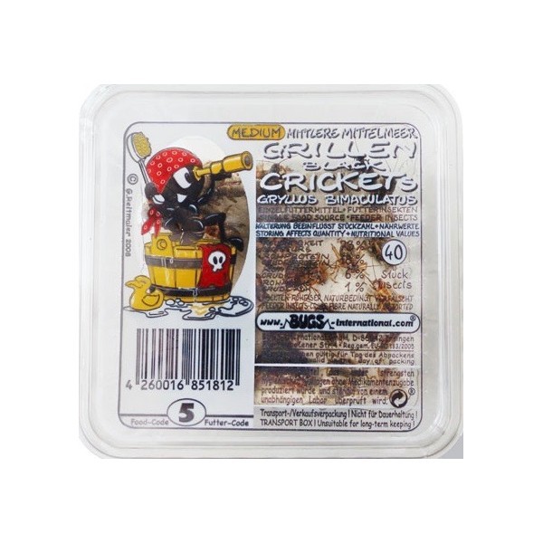 Boite de 40 Pièces en Taille 6 = 1,0-1,5 cm Le grillon, Achetae domestica,  Nous vous proposons 4 tailles de grillons, afin de bien respecter les proportions insecte/animal. La taille correspond au nombre de mues que le grillon a effectué depuis sa naissance :  - Taille 2 : environ 1-2 mm (2 mues) Mico - Taille 3 : environ 5-7 mm (3 mues) Petit - Taille 4...