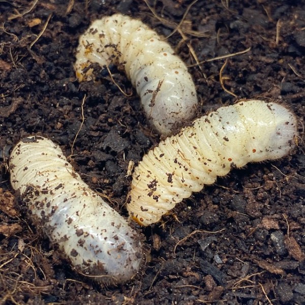 Boîte d'une dizaine de grosses larves de l'espèce Pachnoda marginata.