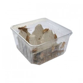 L’Achetae Domestica, est un grillon idéal car il supporte bien les variations de température et est peu cannibale. La conservation est donc aisée. Voici quelques conseils pour leur maintenance : Evitez la moisissure, l’humidité, la condensation. Lorsque vous les recevez, sortez les de leur boite, et mettez les dans un autre récipient très aéré. Voir les vivariums plastiques sur le site, sinon dans un seau (il ne saute pas beaucoup). Il leur faut du sec. Donnez leur une boite avec du Natural Water (en vente sur le site) ou une éponge humide que vous devrez maintenir propre. Donnez leur à manger du Grillon Mix (en vente sur le site), ou un mélange de céréales de votre composition. A cela ajoutez un peu de végétaux peu humides : carottes (en rondelles), choux, patates (en rondelle) En disposant une lampe (basique) sur le dessus, ou une plaque chauffante dessous vous permettrez au milieu de rester sec et donc sain. Température idéale : 23-25 °. - Les cachettes : nous utilisons des emballage cartons pour les œufs, mais vous pouvez aussi froisser du papier journal. Nous achetons des grillons de qualité (ce sont pas les moins cher), afin que les envois se passent le mieux possible, et que vous puissiez les conserver longtemps. La durée de vie d’un grillons est de 2 / 3 mois. A partir du moment où il se reproduit, sa durée de vie diminue très vite.