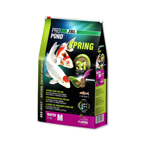 Aliment de printemps pour koïs et poissons de bassin. Plaquettes flottantes de 5 mm pour poissons de plus de 15 cm et pour une température de l'eau supérieure à 10°C.