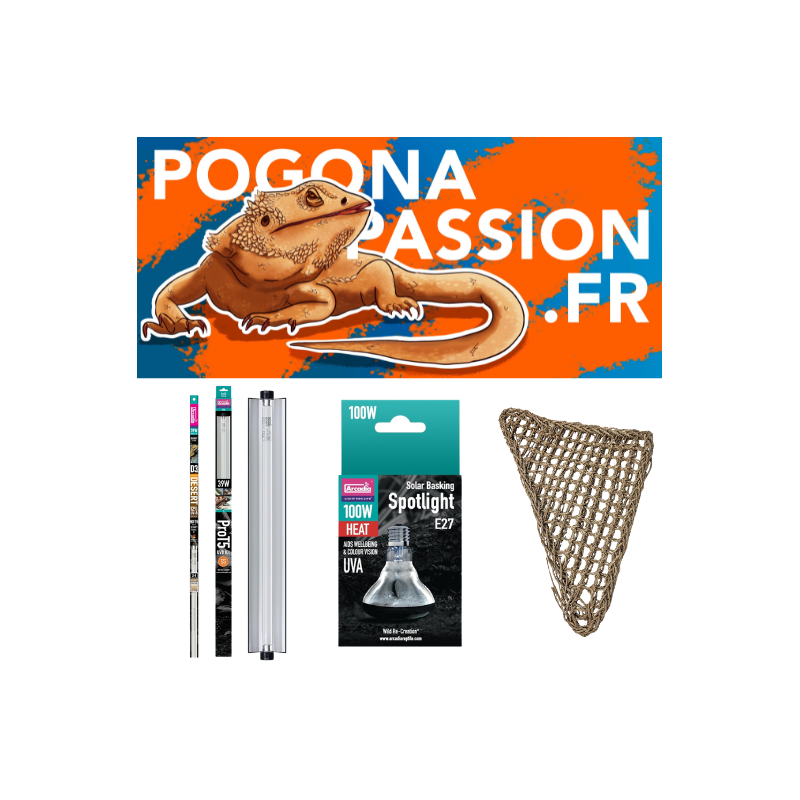 Ce pack a été créé par Nicolas du groupe Facebook pogona passion.fr pour aider les personnes à commencer avec le bon équipement pour leur POGONA Le pack comprend : 1 x Pro T5 Arcadia UVB Kit 12% 39W : 90cm 1 x SOLAR BASKING SPOTLIGHT 100W 1 x REPTO CERAMIC LAMP HOLDER 150 W 1 x EARTH PRO-A 100 G 1 x EARTH PRO CA 100 G 1 x REPTO DIGITALES THERMO HYGROMETER
