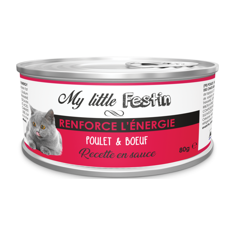 Eau, Bœuf 26%, Poulet 26%, Graisse de poulet 2%, Fécule de tapioca 1,5%, Farine d'os de thon 0,8%. Additifs : épaississant (E412), phosphate d'ascorbyle de sodium et de calcium, VITAMINES (SUPPLÉMENT DE VITAMINE E, MONONITRATE DE THIAMINE, SUPPLÉMENT DE VITAMINE A, NIACINE, PANTOTHÉNATE DE D-CALCIUM, SUPPLÉMENT DE RIBOFLAVINE, CHLORHYDRATE DE PYRIDOXINE, SUPPLÉMENT DE VITAMINE B12, BIOTINE, FO ACIDE LIC , COMPLEXE MENADIONE BISULFITE (SOURCE D'ACTIVITÉ VITAMINE K)), L-CARNITE L-TARTRATE. Constituants analytiques : Protéines 11,5%, matières grasses 1%, Cellulose brute 1,5%, Humidité 82,5%, Cendres brutes 3%.