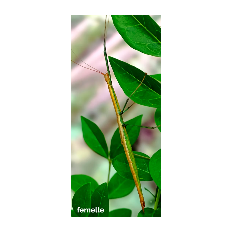 Jeune L3 vendu à l'unité  Origine : Malaisie Alimentation : Ronces, Pyracantha, Rosier, Aubépine, Chêne, Hêtre, Lierre, Eucalyptus. Maintenance : 22° à 25° pour un développement idéal. Phasme « géant » au dimorphisme sexuel très important bien visible au troisième stade.