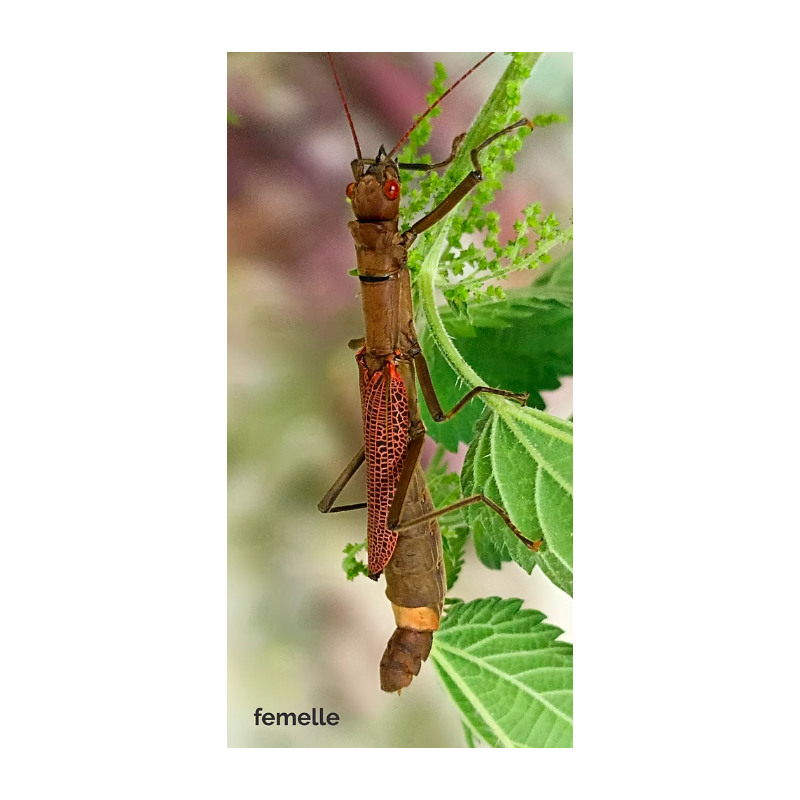 Jeune L3 vendu à l'unité  Origine : Viêt Nam "Nui Chua" - Taille des adultes (corps + pattes antérieures) Femelle : 14 cm Mâle : 9 cm - Terrarium : 30cm x 30cm x 45cm avec un côté aéré. - Température : environ 18 à 20°C la nuit et 20 à 25°C le jour. - Hygrométrie : 60/80% - Plante(s) nourricière(s) : Ronce Millepertuis etc... - Durée de vie des adultes:...
