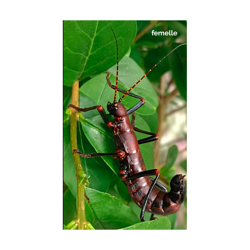 Couple L3 Origine : Malaisie Alimentation : Ronces, Pyracantha, Rosier, Aubépine, Chêne, Hêtre, Lierre, Eucalyptus. Maintenance : 22° à 25° pour un développement idéal. Phasme « géant » au dimorphisme sexuel très important bien visible au troisième stade.