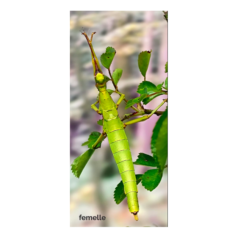 Jeune L3 vendu à l'unité Origine : Malaisie Alimentation : Ronces, Pyracantha, Rosier, Aubépine, Chêne, Hêtre, Lierre, Eucalyptus. Maintenance : 22° à 25° pour un développement idéal. Phasme « géant » au dimorphisme sexuel très important bien visible au troisième stade.