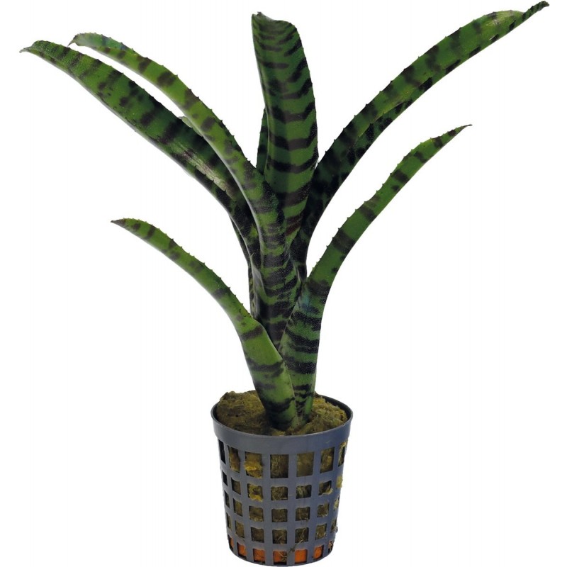 Cette plante aux longues feuilles pointues absorbe l'eau par sa coupe centrale. La couleur est principalement verte avec des reflets rouges et parfois des taches blanches.