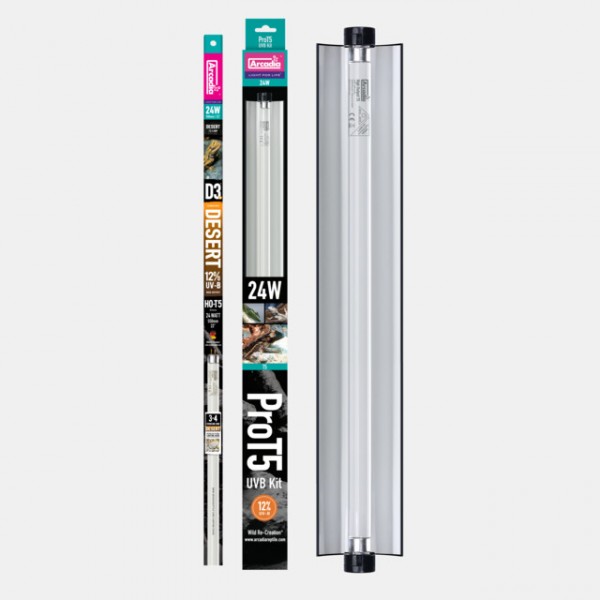 ProT5 est un kit d'éclairage complètement adaptable avec une électronique interne de haute qualité, un réflecteur hautement efficace et amovible, un câble d'alimentation, un kit de raccords, un câble de liaison et votre choix de lampe UV-B Arcadia Reptile HO-T5.