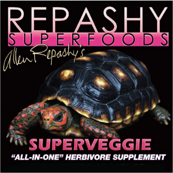 Le Respashy Superveggie (Repashy Superfoods) est un complément alimentaire tout-en-un (calcium + vitamines) adapté aux reptiles herbivores et omnivores ainsi qu'aux amphibiens. Il est particulièrement adapté aux tortues terrestres (type Testudo hermanni, Geochelone sulcata, Geochelone pardalis, etc.).