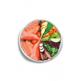 COMPOSITION : saumon frais 70%, petits pois, pomme de terre, protéines de pomme de terre, pomme, potiron 2%, saumon hydrolysé, levures, brocoli 1%, huile de poisson, minéraux, graines de lin, canneberges 0,30%, inuline (FOS), mannan-oligosaccharides ( MOS), romarin, glucosamine, Yucca schidigera, sulfate de chondroïtine.