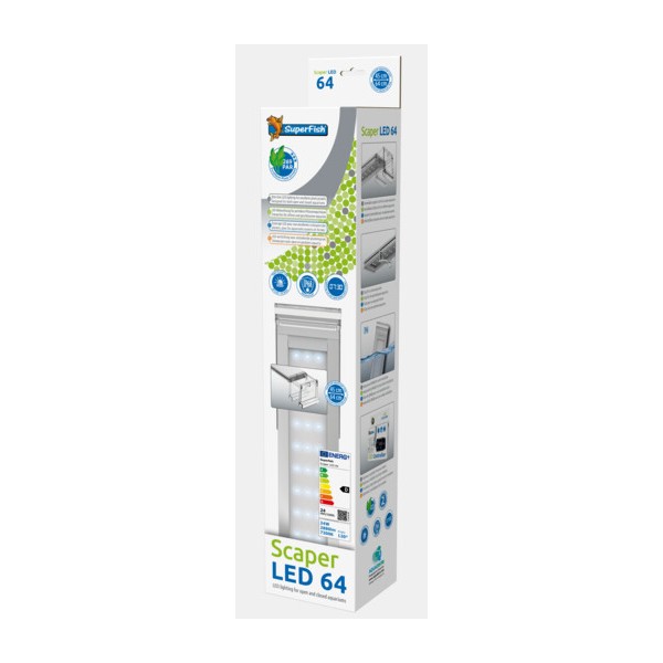 Éclairage LED design Slim-line pour les aquariums ouverts et fermés d'une taille comprise entre 45 et 64 cm • Conçu pour une excellente croissance des plantes et l’aquascaping • 48 LED haute puissance (24 W) avec une luminosité élevée et une longue durée de vie (50.000 h) • Par 269 (μmol/m2/s), Lux 16100 (lx), Kelvin 7300 (K) • La partie de la lumière (400-700 nm) que les plantes utilisent pour la photosynthèse est appelée rayonnement photosynthétiquement actif (PAR). Plus le PAR est élevé, meilleure est la croissance de la plante • Kit complet avec un câble de 200 cm, un interrupteur, un adaptateur, supports extensibles pour un aquarium ouvert et clips pour un aquarium fermé