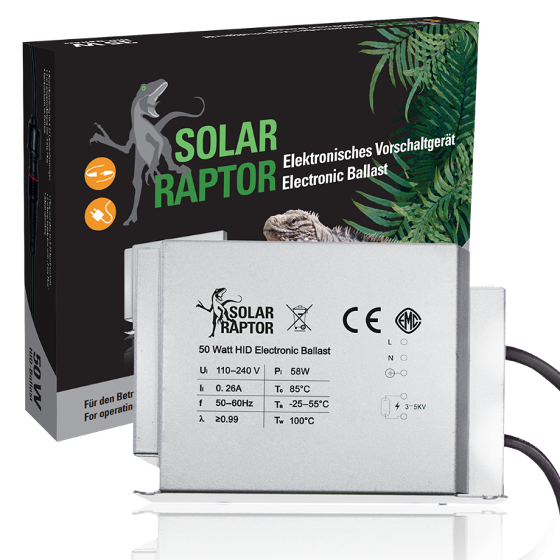 SolarRaptor EVG 35 W Est un ballast électronique pour les projecteurs de terrarium d'une capacité maximale de 35 watts. Tout comme les lampes HID, une variété de projecteurs de terrarium nécessitent un ballast électronique pour passer en mode opérationnel.