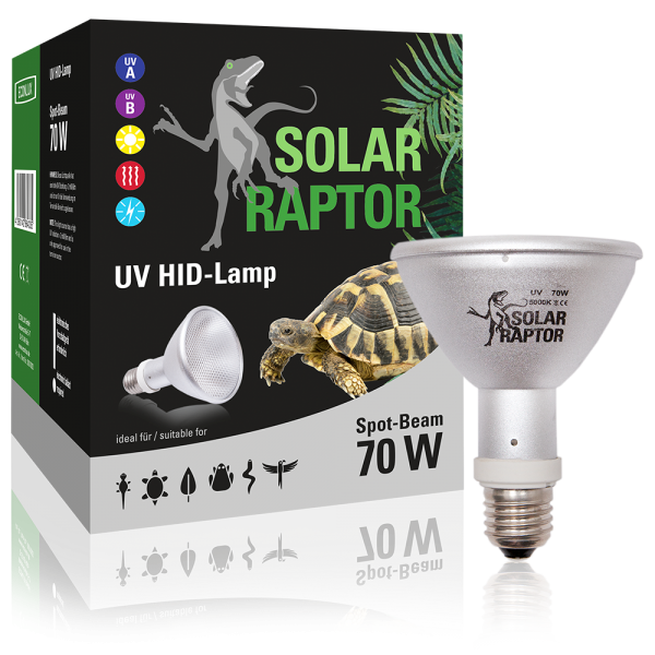 Les lampes UV HID SOLAR RAPTOR® sont une solution complète optimale pour les animaux de terrarium diurnes qui ont besoin d'une lumière semblable à celle du soleil avec rayonnement UV et chaleur. Les lampes UV modernes aux halogénures métalliques haute pression atteignent la portée naturelle du soleil avec environ 70 000 lux. Une valeur bien plus élevée que celle des tubes fluorescents, des lampes à lumière mixte et des spots halogènes. Les reptiles qui aiment le soleil sont presque attirés par la lumière et profitent de la chaleur ensoleillée.