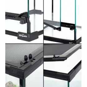 Terrarium en kit avec portes Facile à installer avec passe câbles, possibilité d'immerger le bas du terrarium. Grilles d'aération sur le dessus et latérales, avec une porte battante verrouillable.