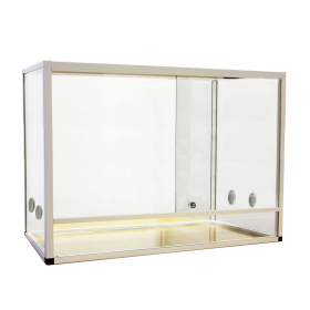 Terrarium déjà monté avec portes en verre, grille d'aération sur le dessus. Possibilité d'immerger le bas du terrarium. Avec une porte battante verrouillable et un espace pour passer les câbles. Dimensions : 90x45x60(H)cm