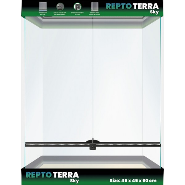 Le terrarium est la base d'un bel habitat pour votre animal. Les terrariums Repto Terra Sky offrent un très grand espace et un bel environnement sain à vos animaux. Le fond étanche et la ventilation sous la porte rendent ces terrariums tout à fait adaptés à la création d'un environnement tropical ou d'un paludarium.
