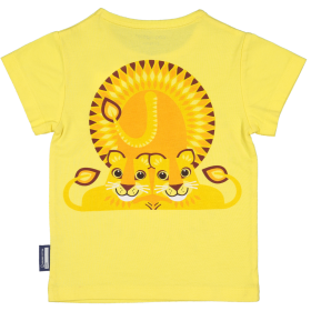 T-shirt jaune enfant manches courtes imprimé lion, en coton biologique, illustré par Mibo.